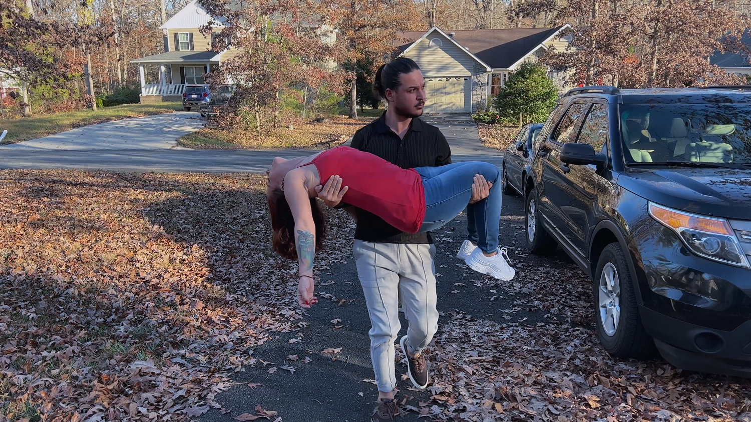 We get a nice cradle carry sequence with Jackson CRADLE CARRYING Fayth outside and around, before arriving back at his warehouse location. He cradles her into a back bedroom, where he lays her on the bed. After looking her over, he gives his partner a call - Rachel Adams! Rachel (in suit and nylons) arrives, and assists Jackson in his latest victim Fayth! Fayth has her shoes removed, and then the rest of her clothing as well, leaving her in just pantyhose. They then take pictures of Fayth's limp body as she remains out, clearly getting her ready to sell off! When Fayth begins to come around, Rachel and Jackson tag-team her with Rachel pinning her down sitting on top of her while Jackson uses the sleepy cloth. Fayth gives a furious struggle but is again put out, disadvantaged by the 2 vs 1. The evil duo again play with her limp body, before deciding to move on to the next step - getting her dressed! They pick out a red one-piece lingerie and nylons for Fayth.